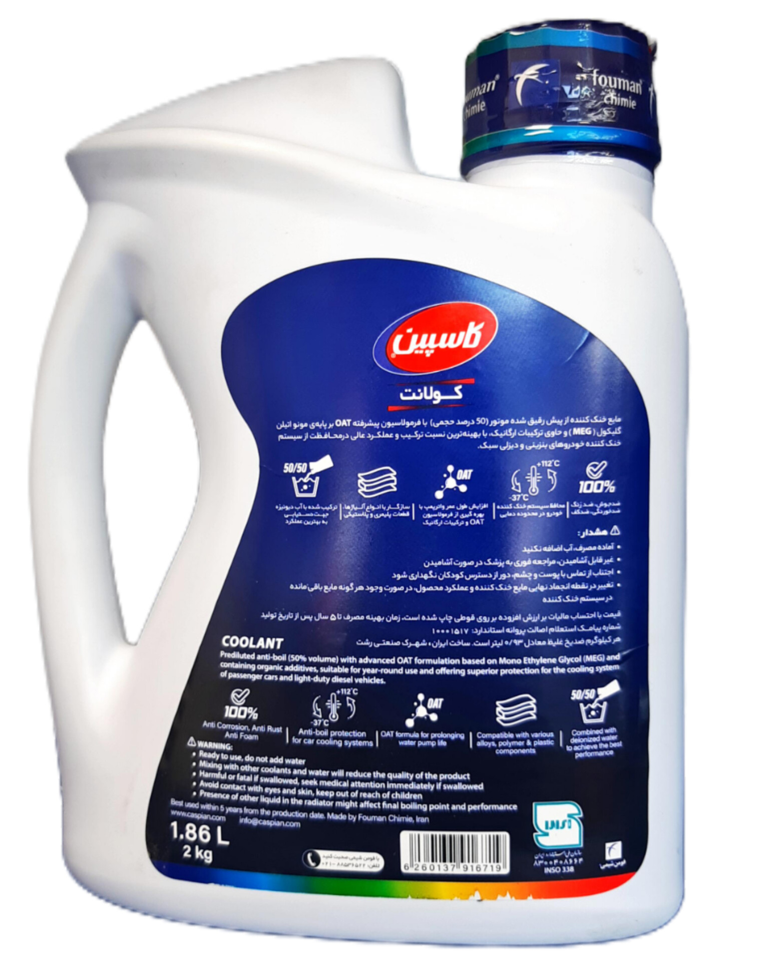 کولانت آماده مصرف کاسپین با فرمولاسیون پیشرفته OAT و بهره گیری از مواد آلی مطابق با استاندارد 338 ایران جهت استفاده در تمامی فصول برای کلیه خودروها تولید شده است. کولانت کاسپین در بهینه ترین نسبت ( 50 درصد حجمی) با آب دیونیزه ترکیب شده است تا رسوبات کم تری در سیستم خنک کننده موتور از خود برجای بگذارد.